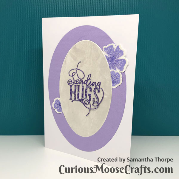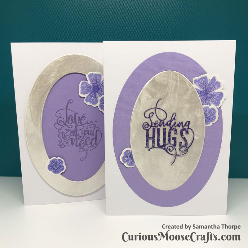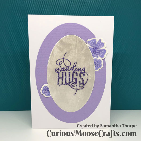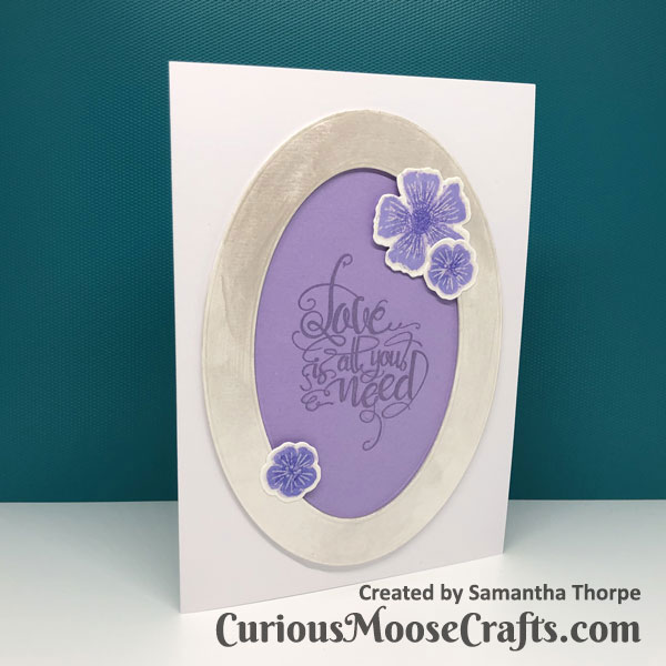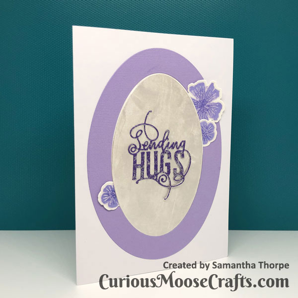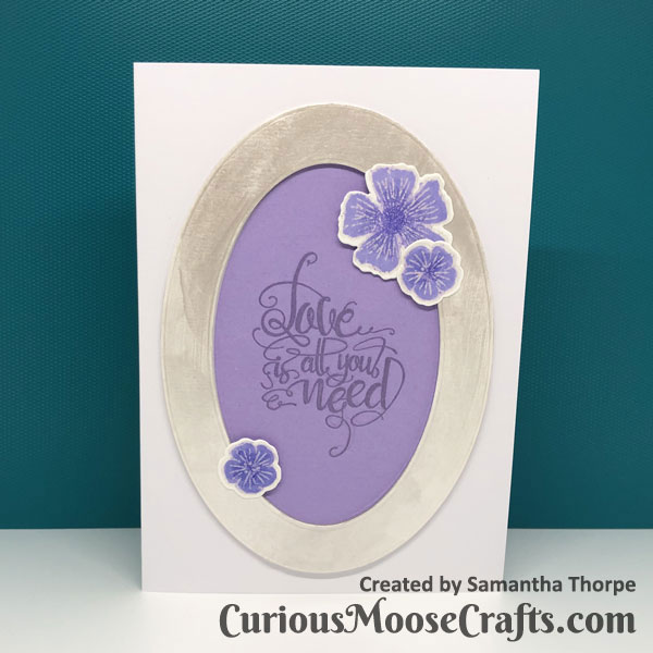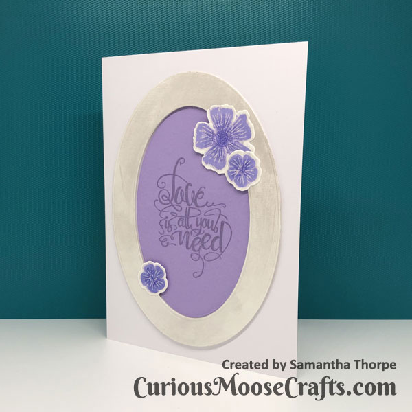 I used the Mauve Purple classic card and some standard white card and cut an oval frame out of each with the dies. The white card I covered both the frame and inside cut out with Pure Platinum Embellishment Mousse.