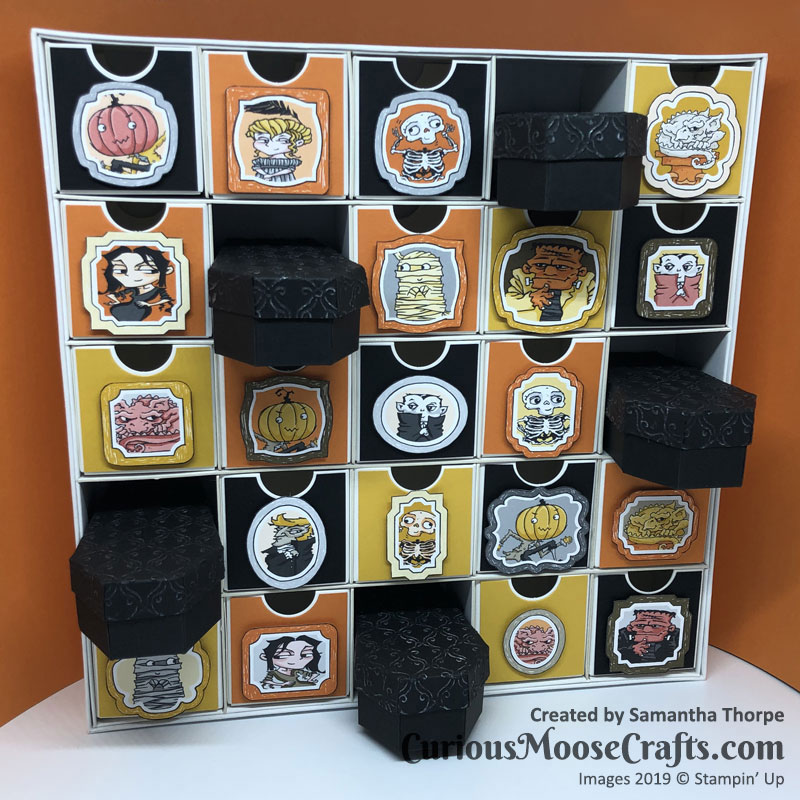 It’s made using a customisable advent calendar from Stampin’ Up! which is available now (see links at the bottom). The extra good bit is that you can decorate the front and back of the boxes separately. So although I have decorated this Halloweeny, I’ll be turning the draws around and Christmassing up the other side. Two for one! I’ll show you my Christmas version next month. I can’t do Christmas until Halloween is over. 🙂
