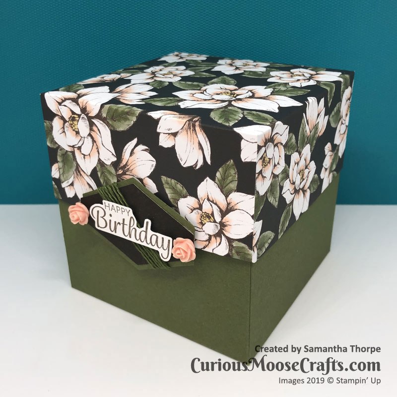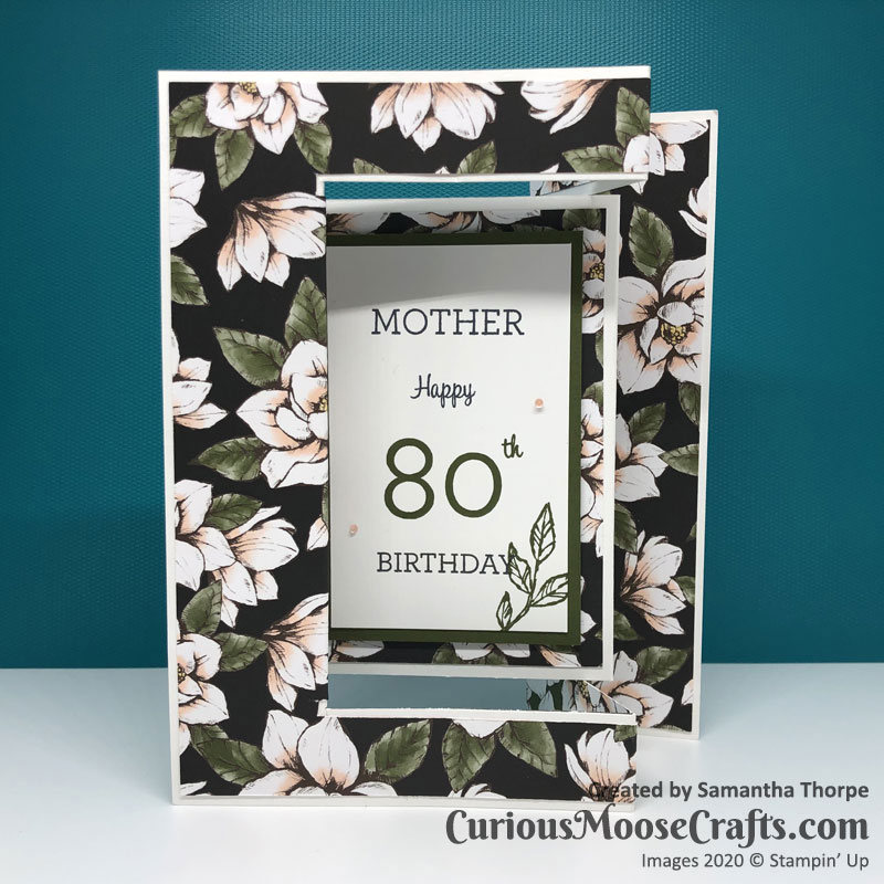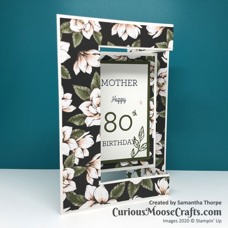 A fancy fold birthday card made with the Magnolia Lane patterned papers. With a matching gift bag and tag for good measure. 🙂 Made for my mother-in-laws special 80th birthday.