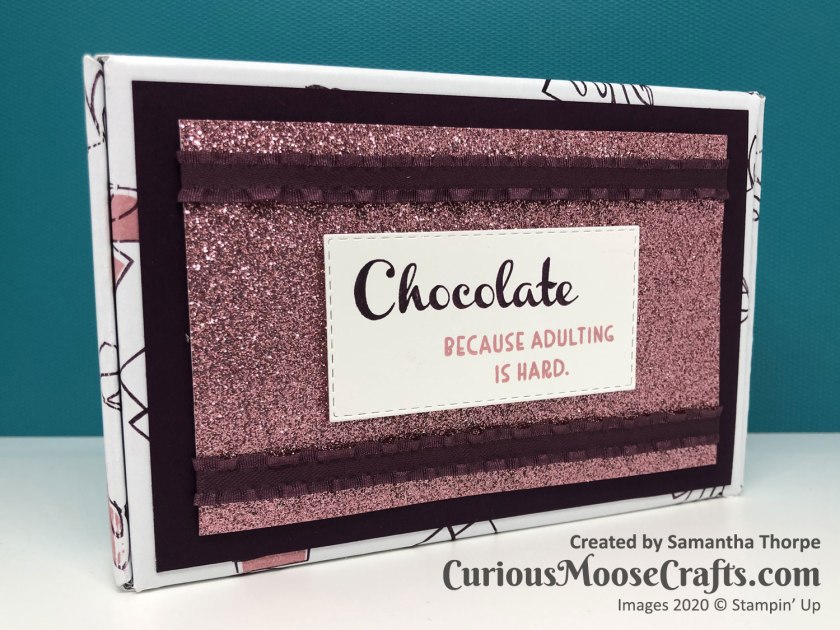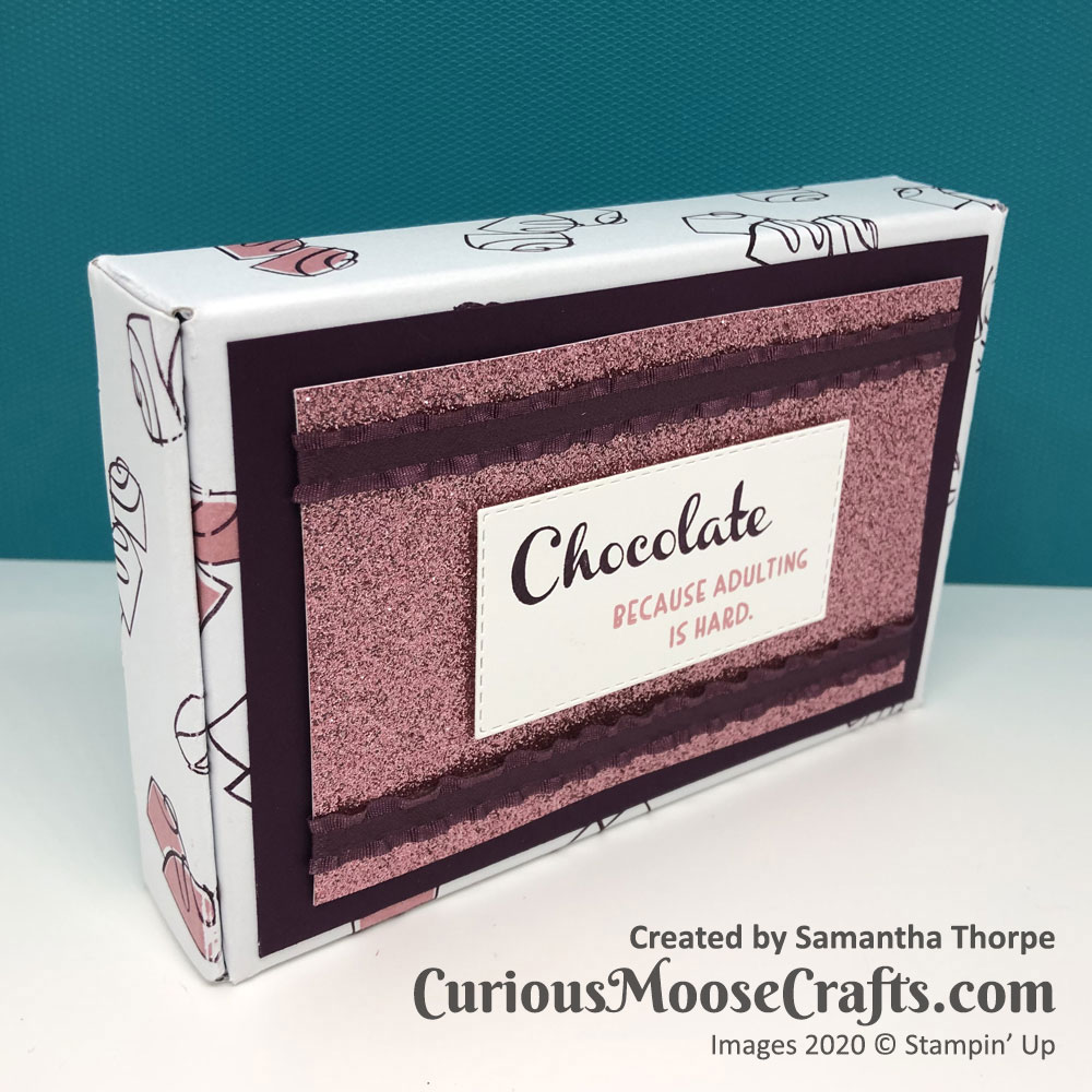 I used the Nothing’s Better Than stamp set to stamp directly onto the boxes in Blackberry Bliss and Rococo Rose. I then decorated the top to match my banner using sentiments from the same stamp set.