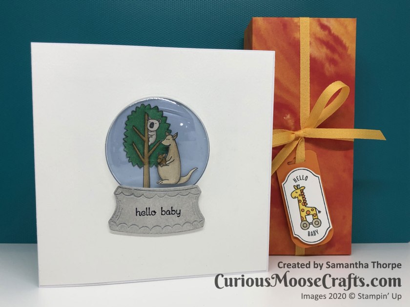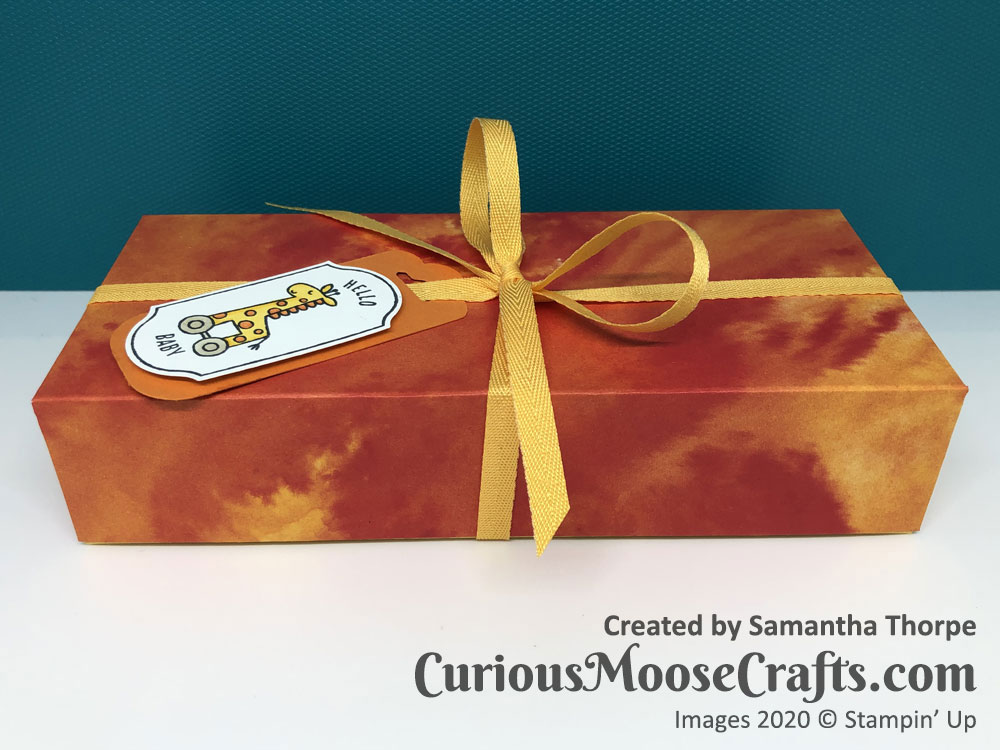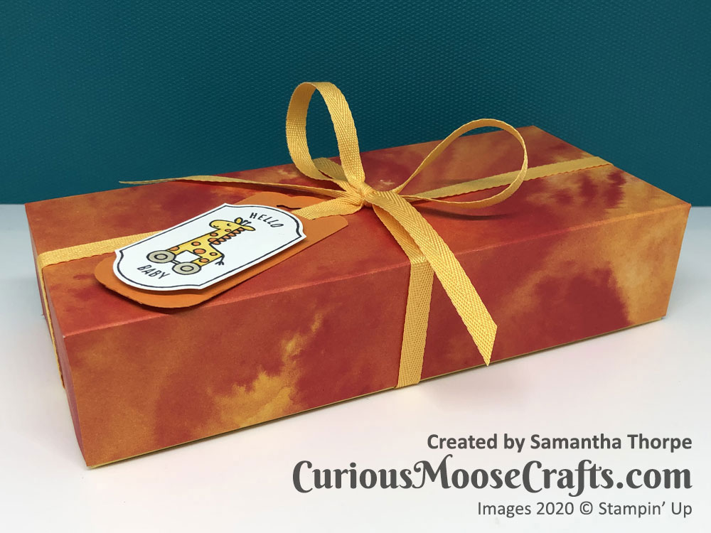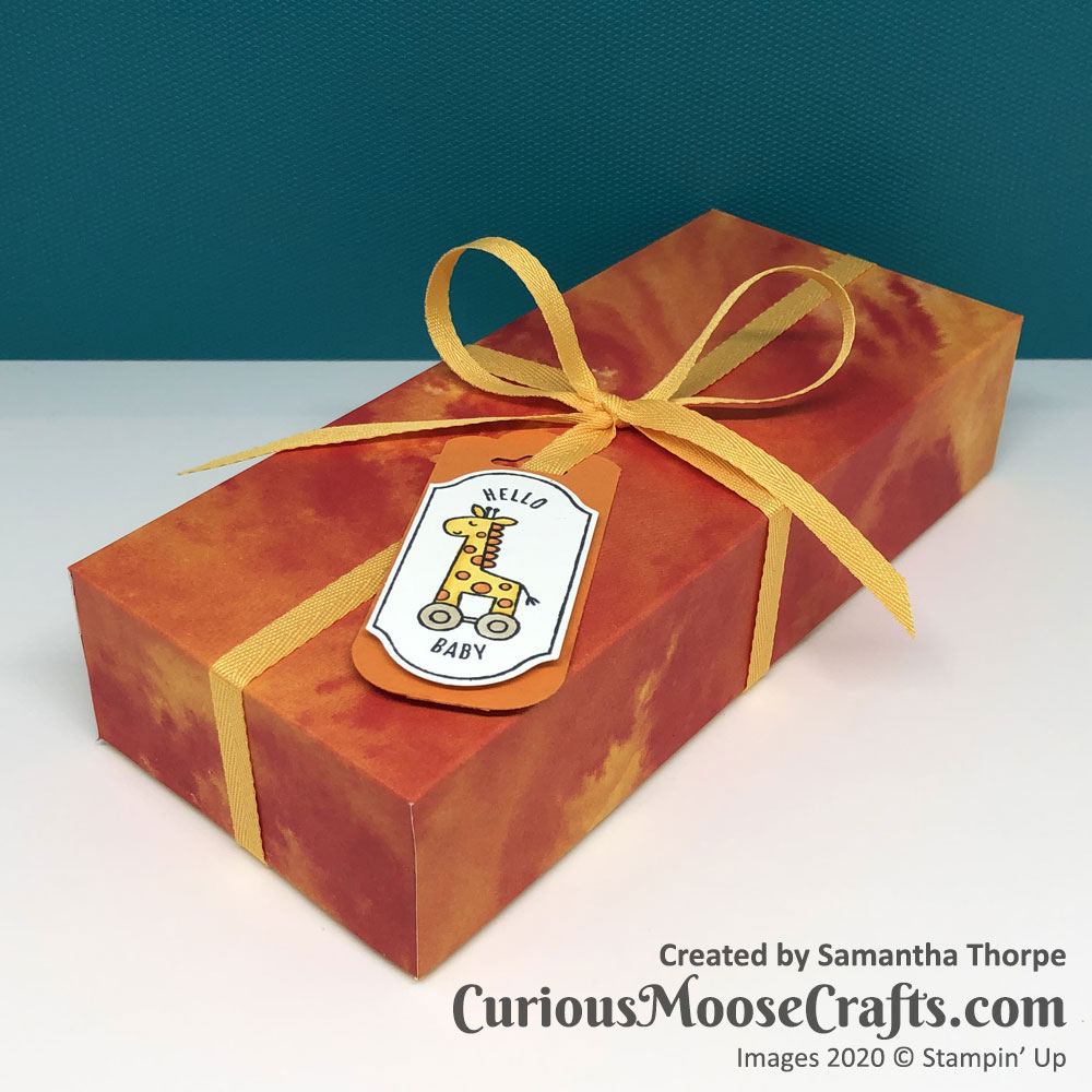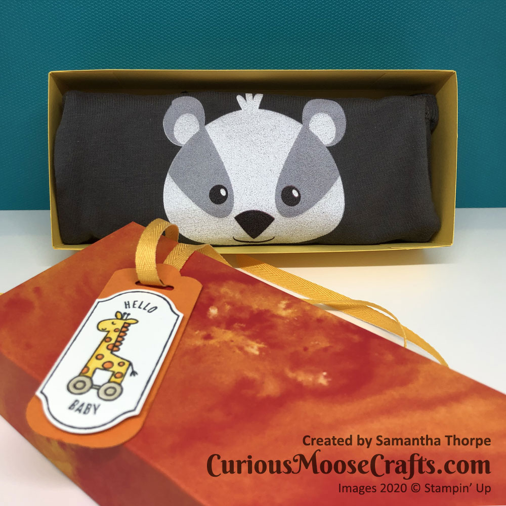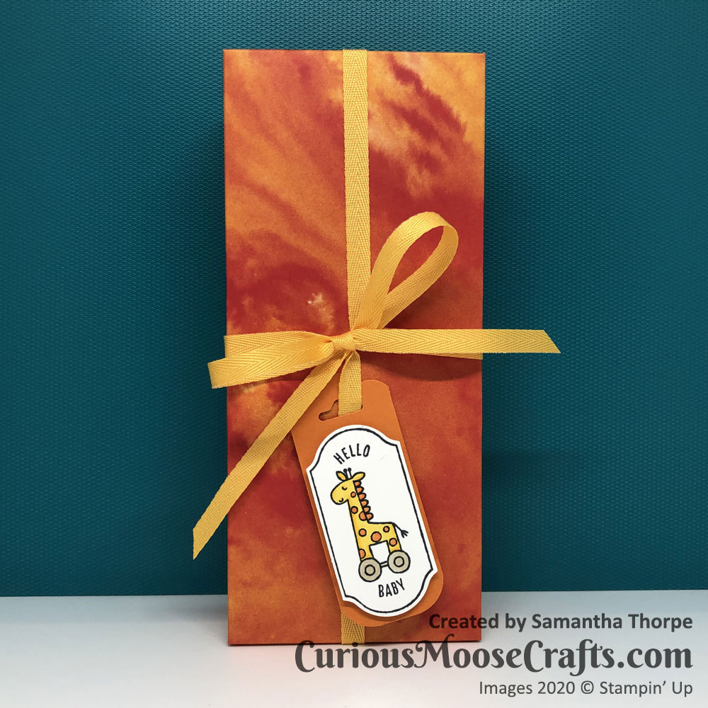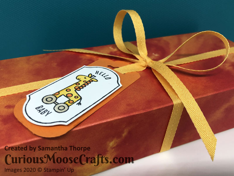 The accompanying present was a cute onesie which of course needed to be custom wrapped. Made with retired paper and Bumblebee 1/4″ ribbon. The tag was made using the Scalloped Tag Topper punch and the retired stamp set and matching Timeless Label punch.