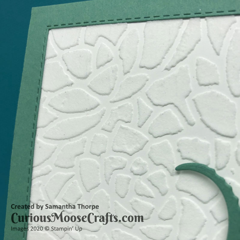 This first card has the full background of embossing paste as the star of the show. With a Just Jade card base and sentiment/die cut embellishment to break up the white.