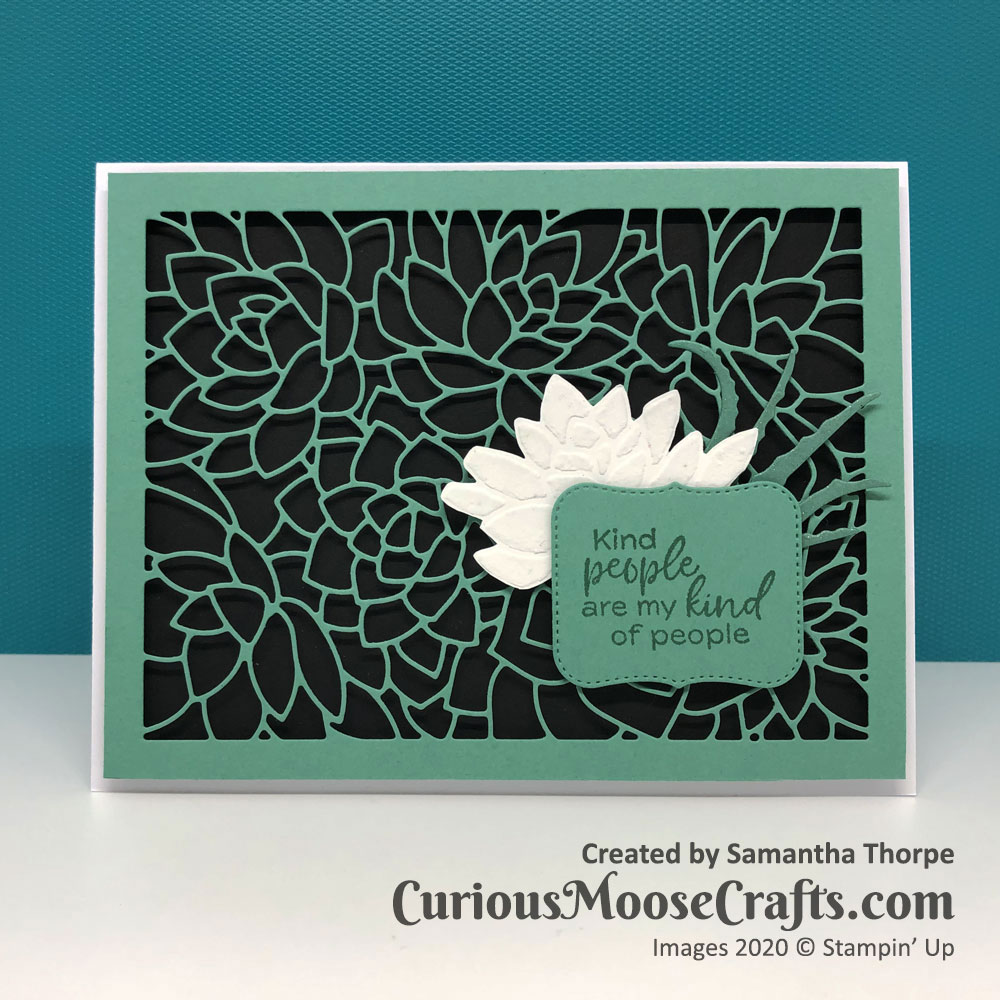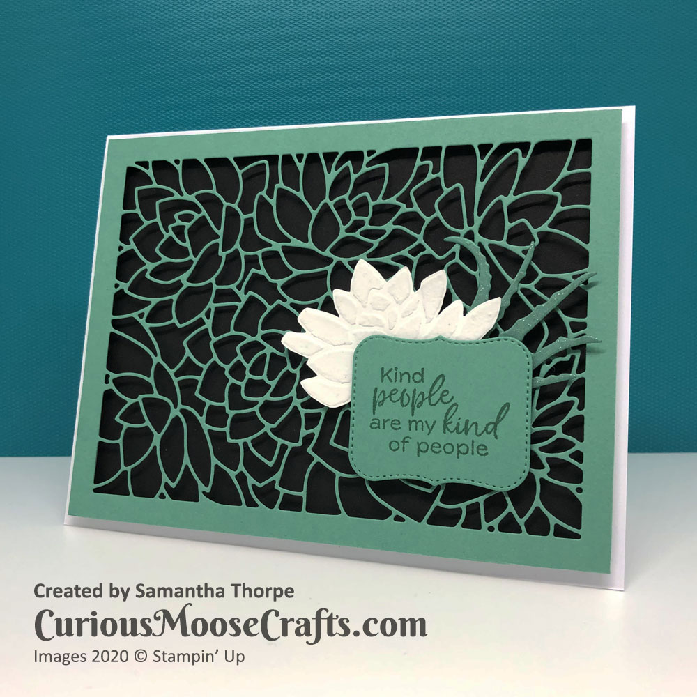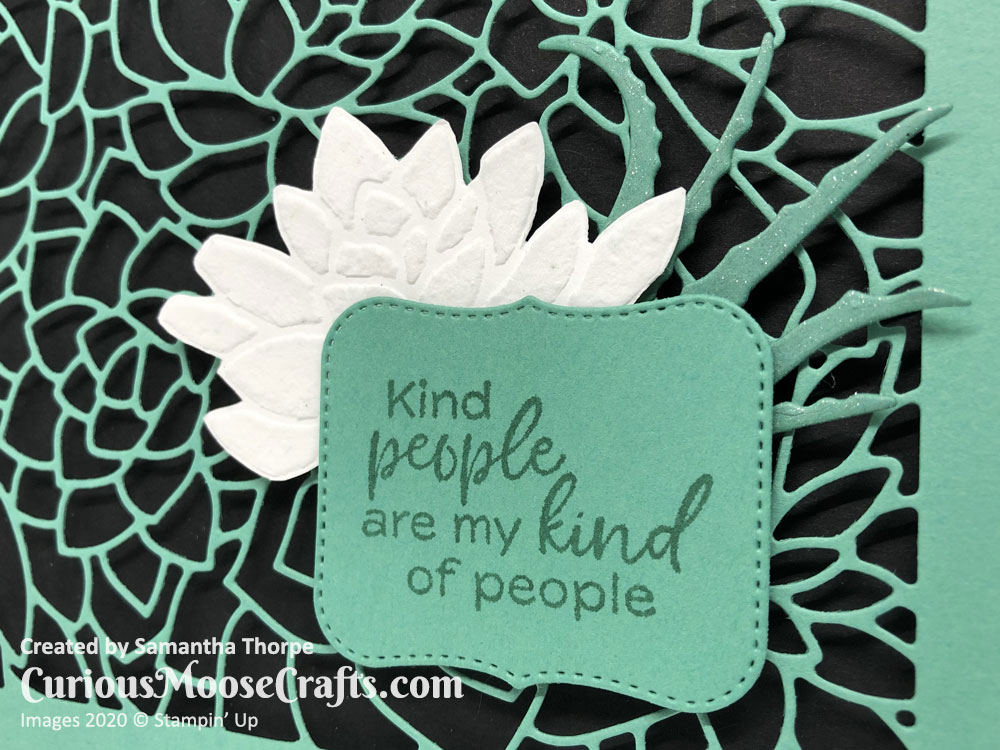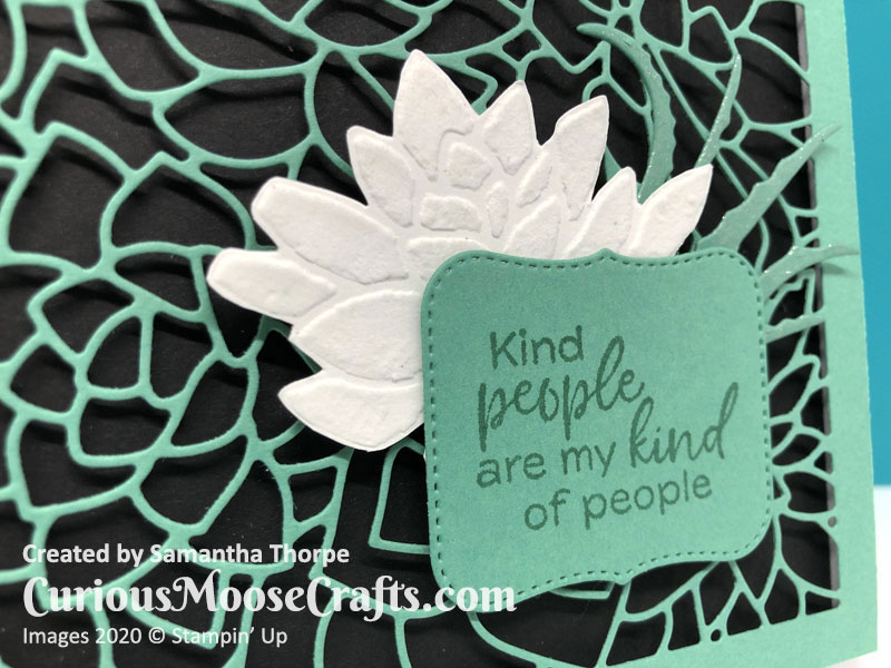 I also used a different sentiment/die frame combination “Kind people are my kind of people”. Which makes for a lovely thank you card I think. Not sure if you can tell but I also added some Wink of Stella for some sparkle on the succulent leaves.