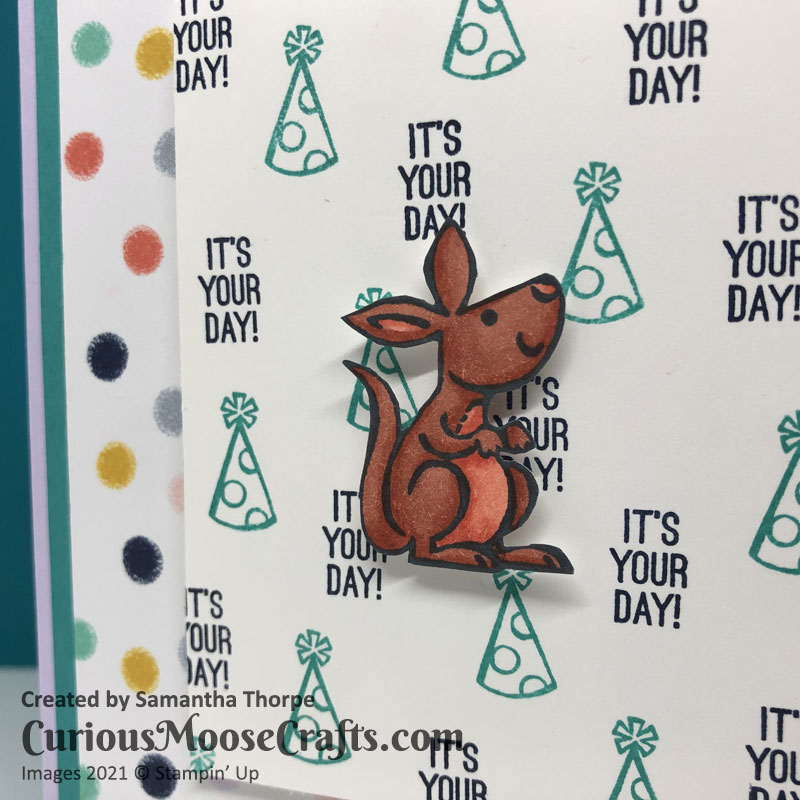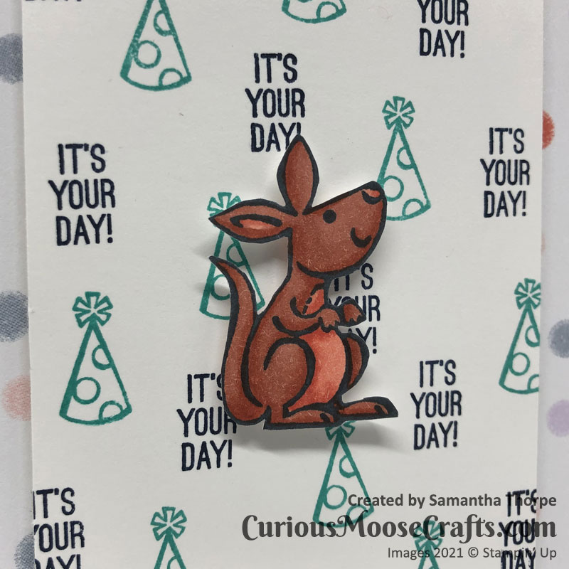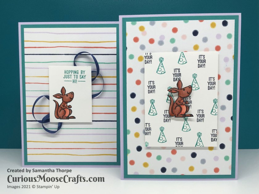 Both cards have a little cute kangaroo coloured with Stampin’ Blends (Cajun Craze and Calypso Coral). They also both have a sheet of patterned paper in the background, though different designs.