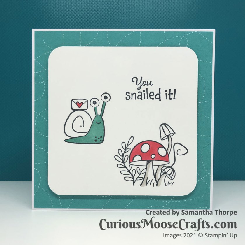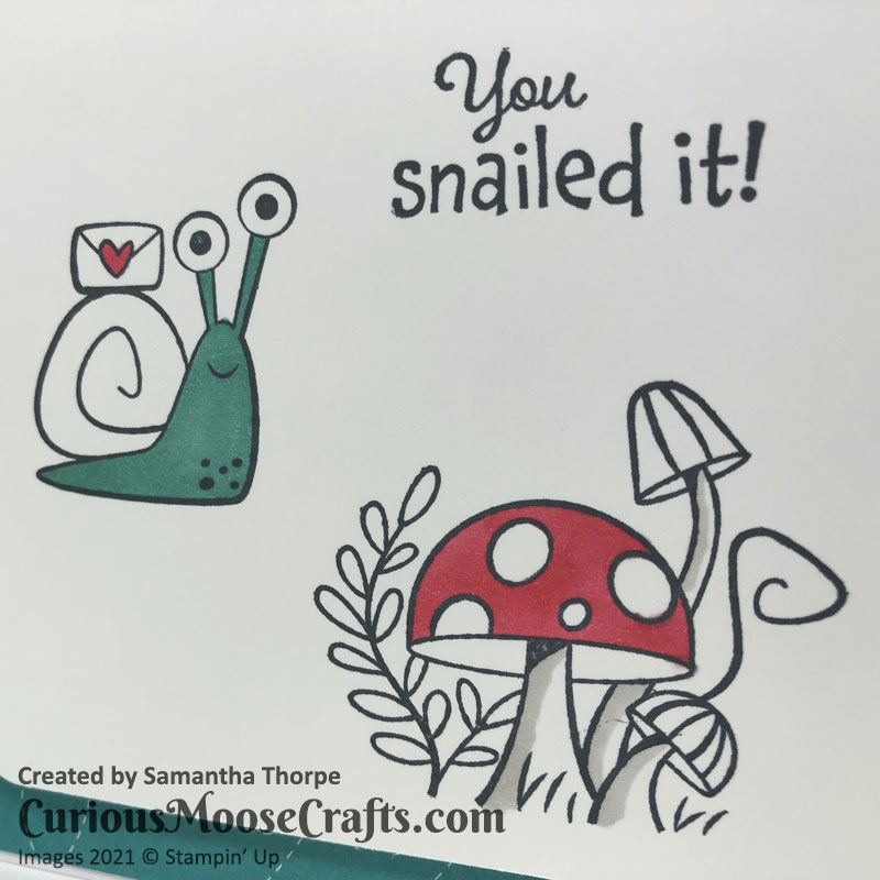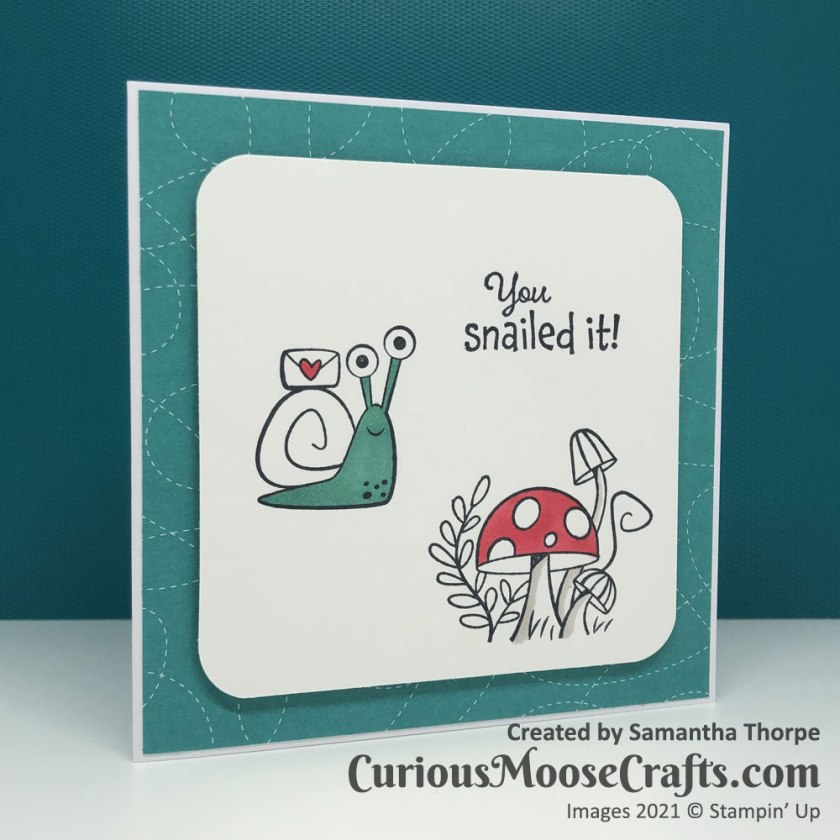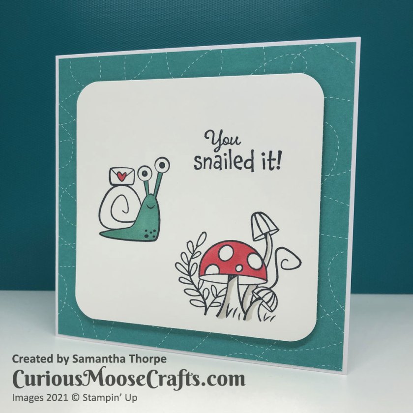 I decided to go with the Snail Mail patterned paper and matching Snailed It set set. I was a little sneaky and rounded the corners of my white card with the Detailed Trio punch. It helps show off the background paper just a little bit more.