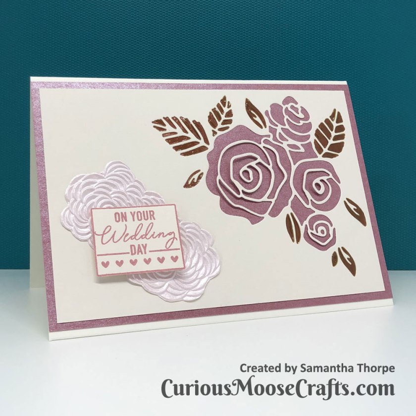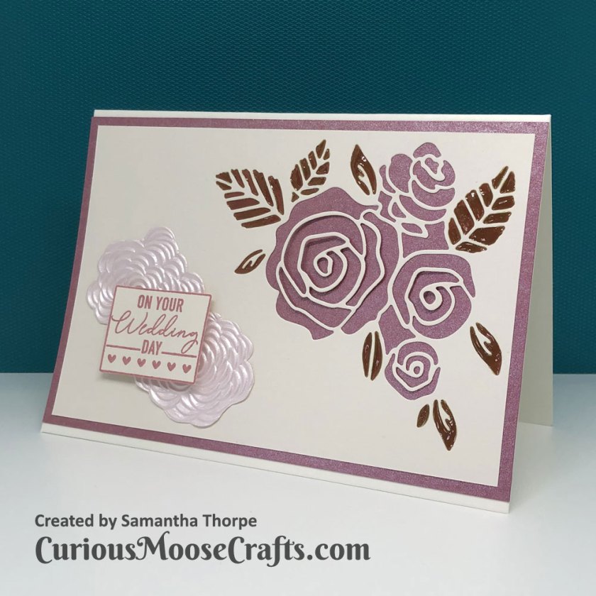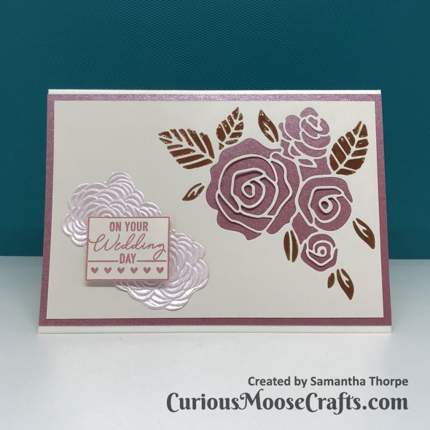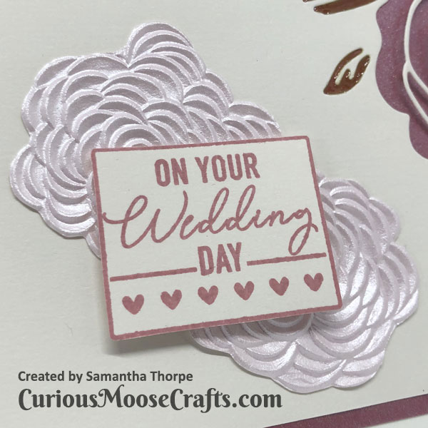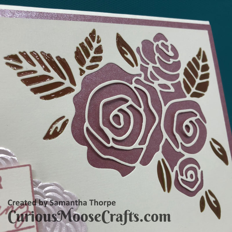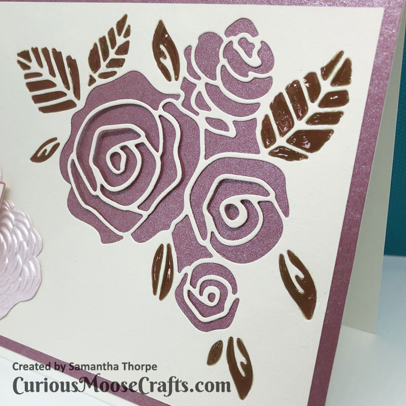 I cut out pieces of the Pink Petals paper to put behind my sentiment and filled in the die cut leaves with the Olive Branch nuvo drop.