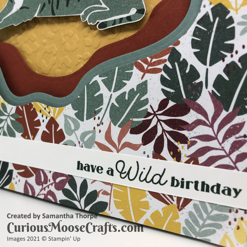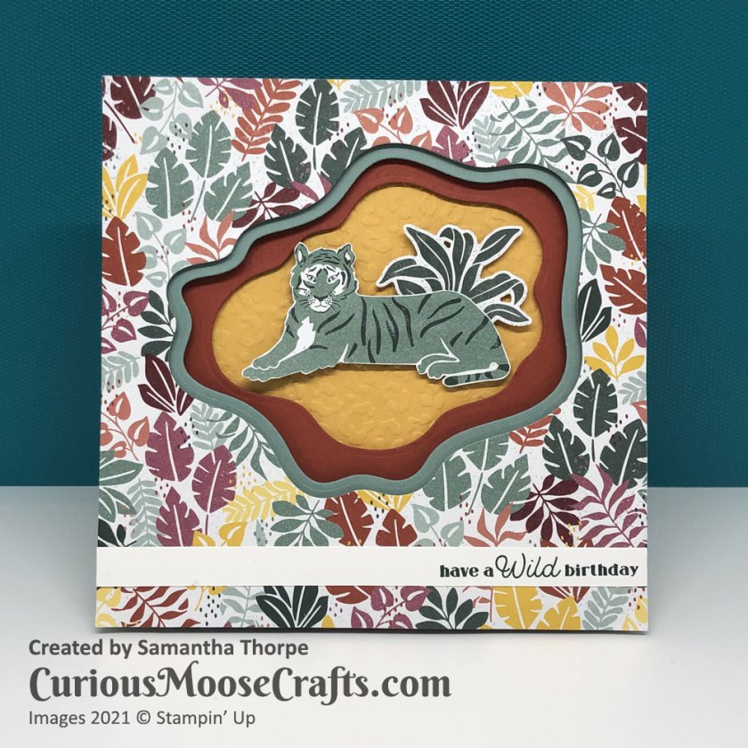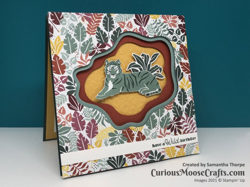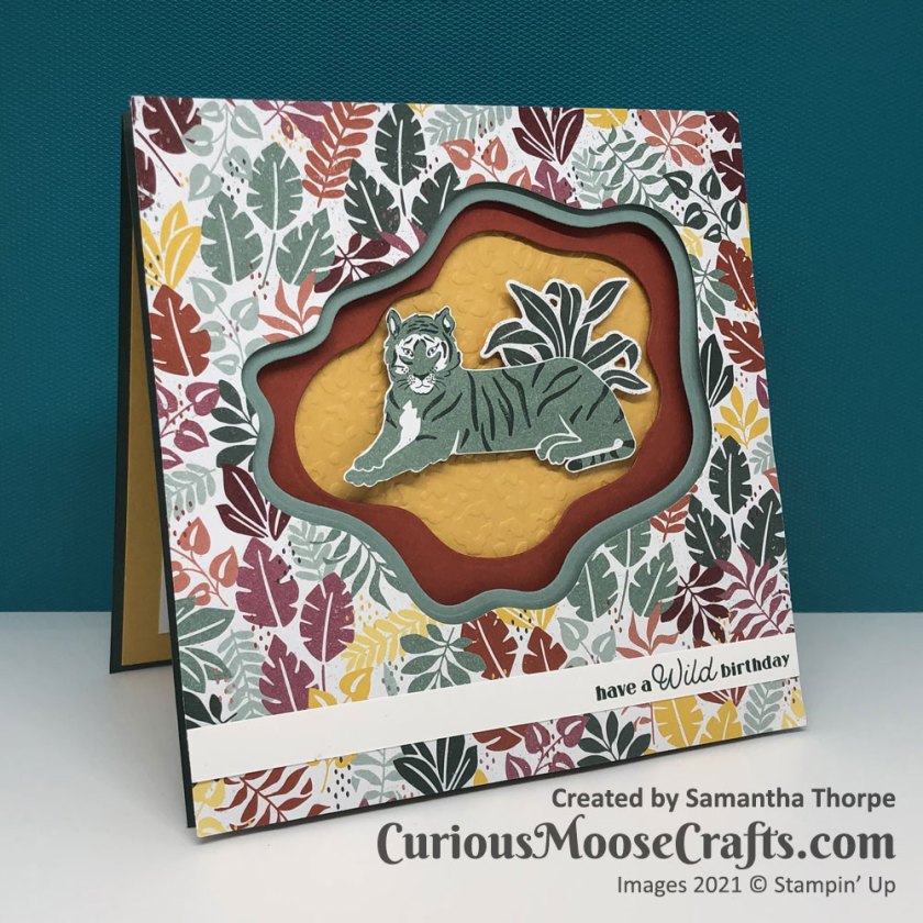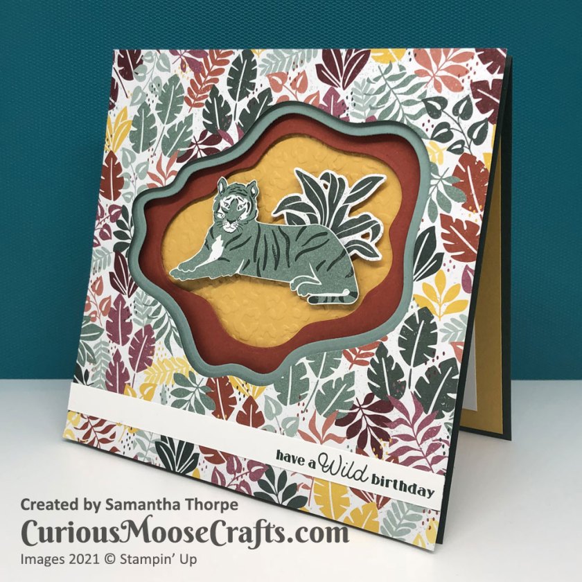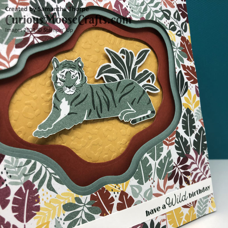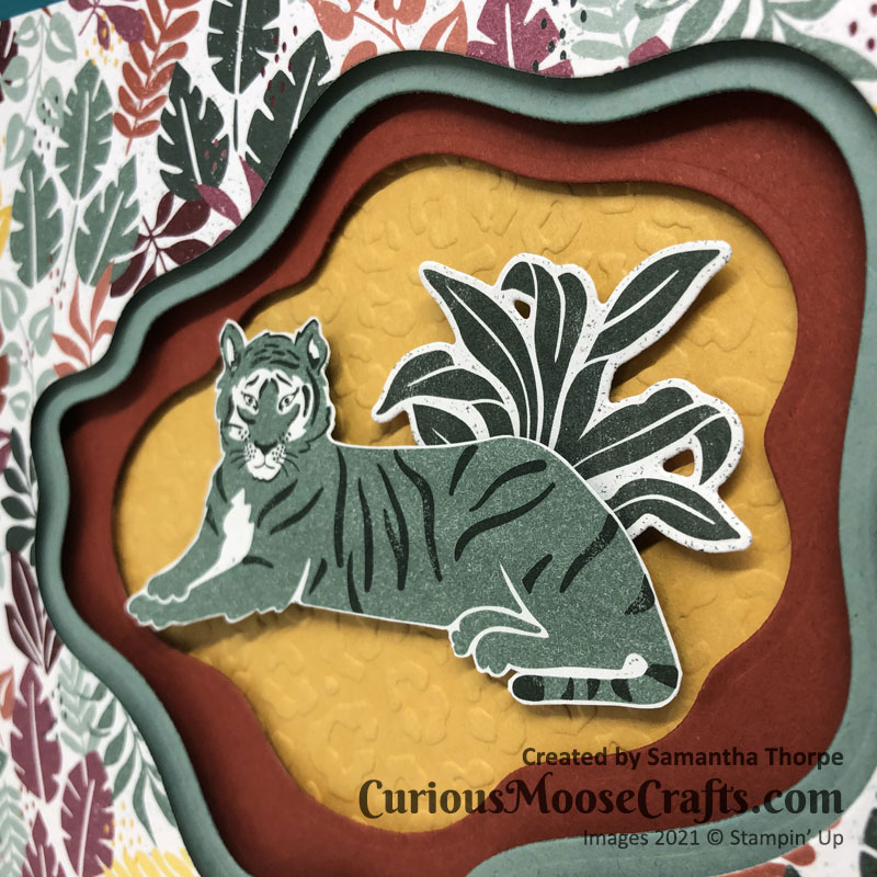 I used a mixture of dies and fussy cutting by hand for the tiger/plant. The yellow (Crushed Curry) card has been run through the die cutting machine in the Animal Print embossing folder. The layers of card cut out with the diorama dies and then separated by a mix of dimensionals and foam strips to give different depths.