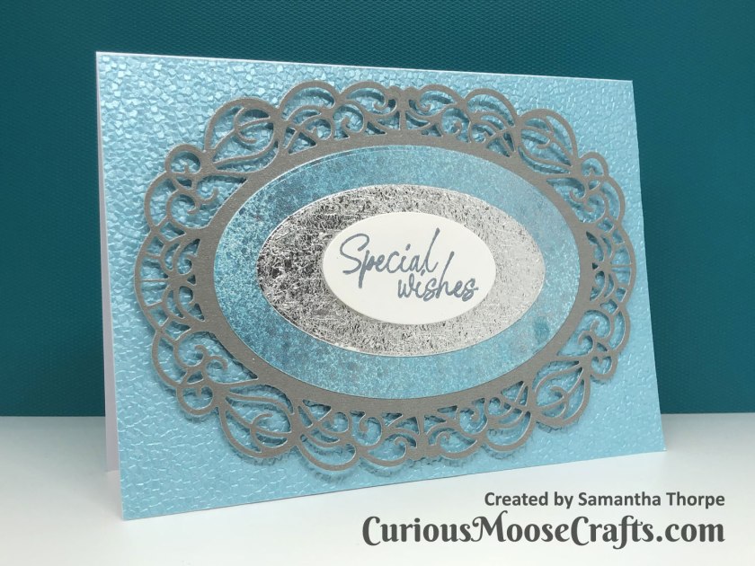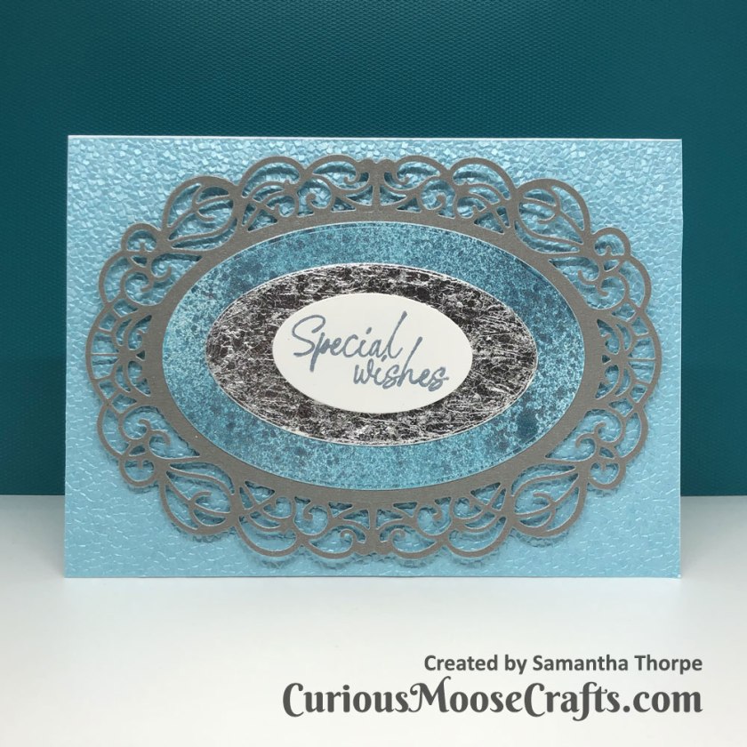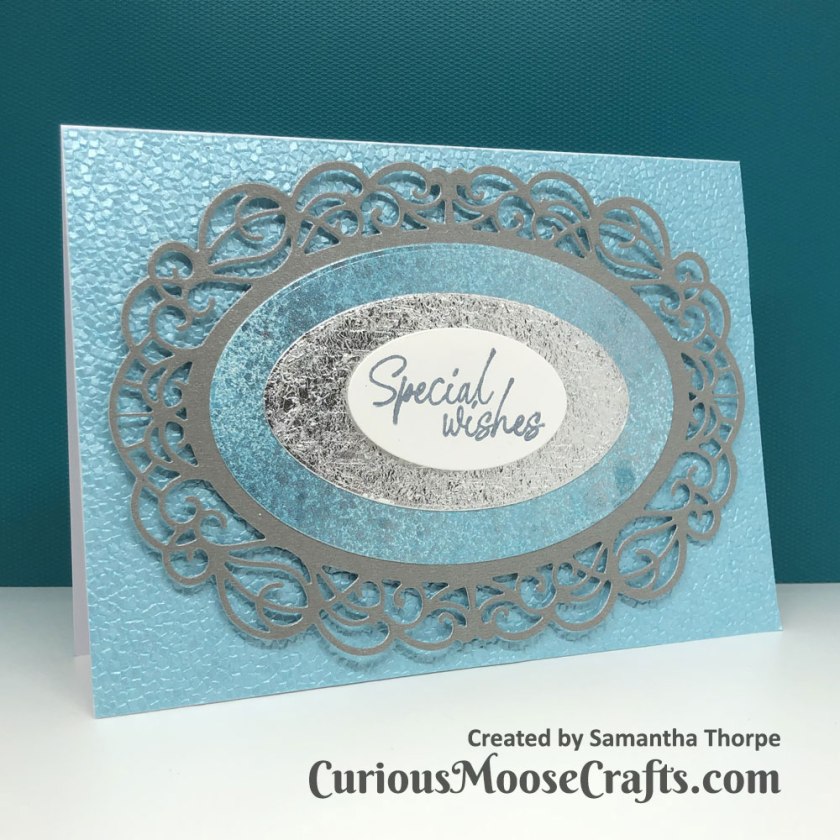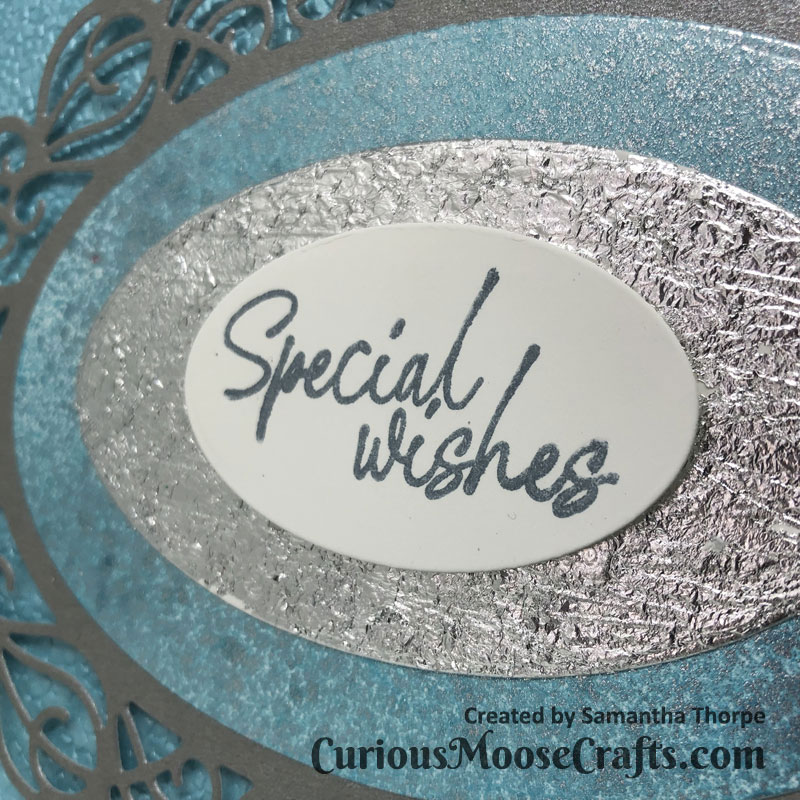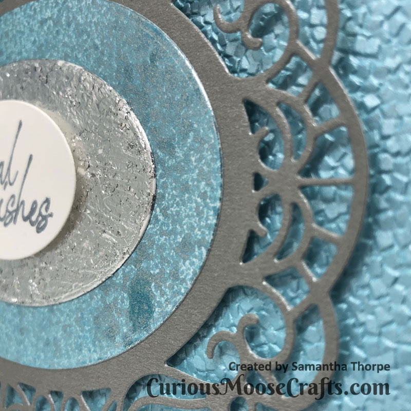 Card number two from kit 43. This time with a blue background using the sparkle spray and a silver background made with gilding flakes – so sparkly! The Arctic Ice speciality paper at the very back has such a lovely texture.