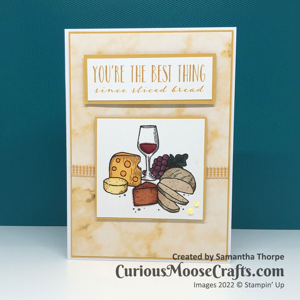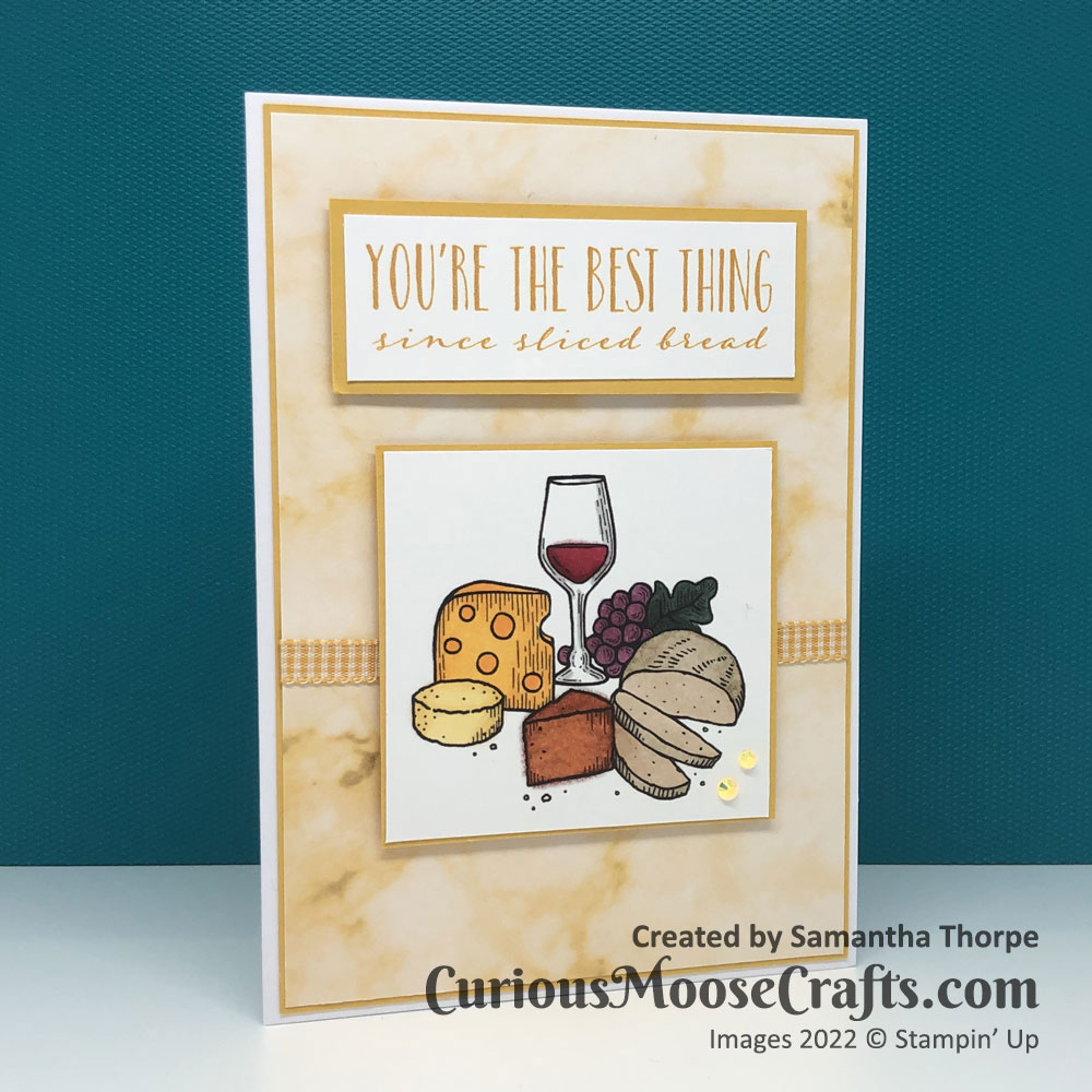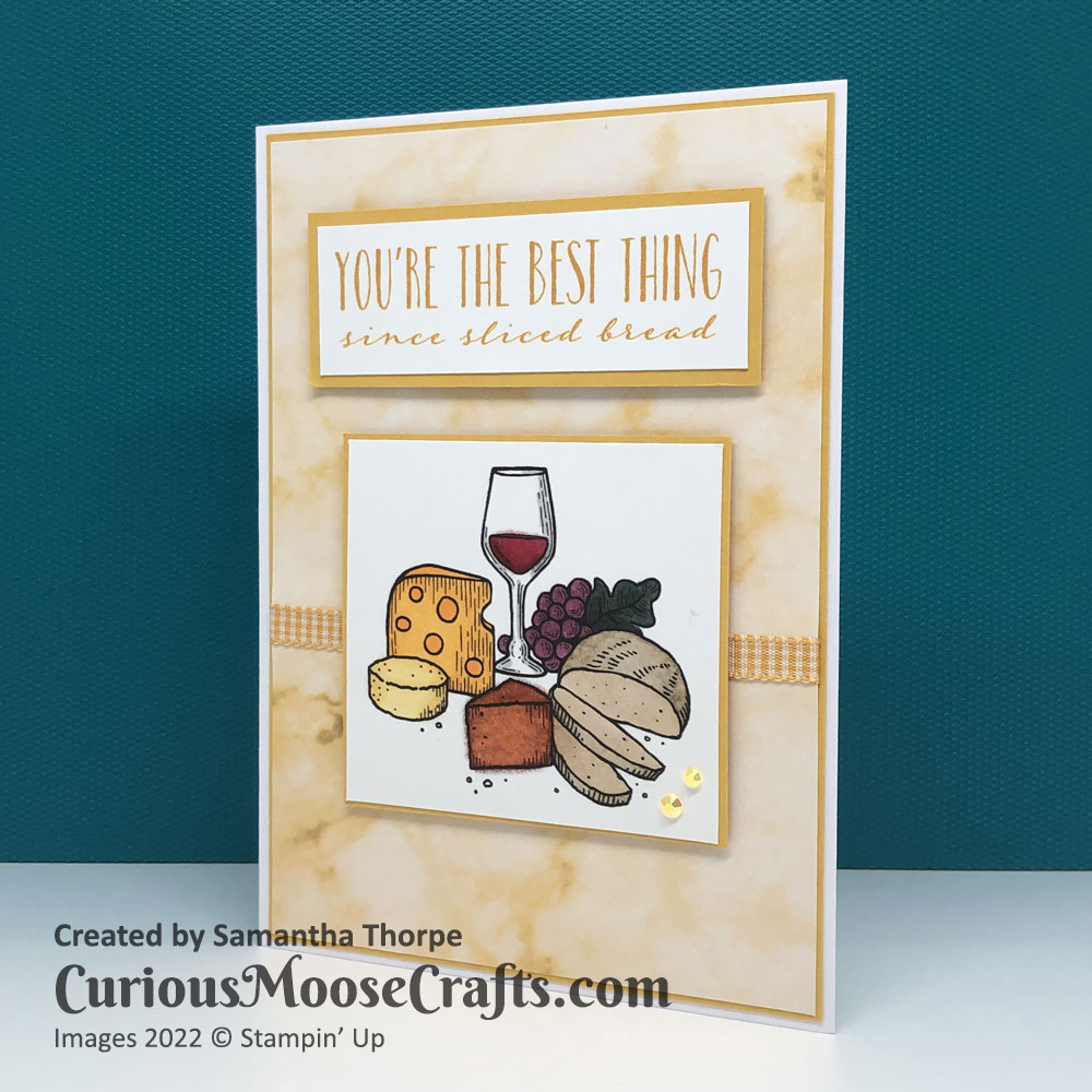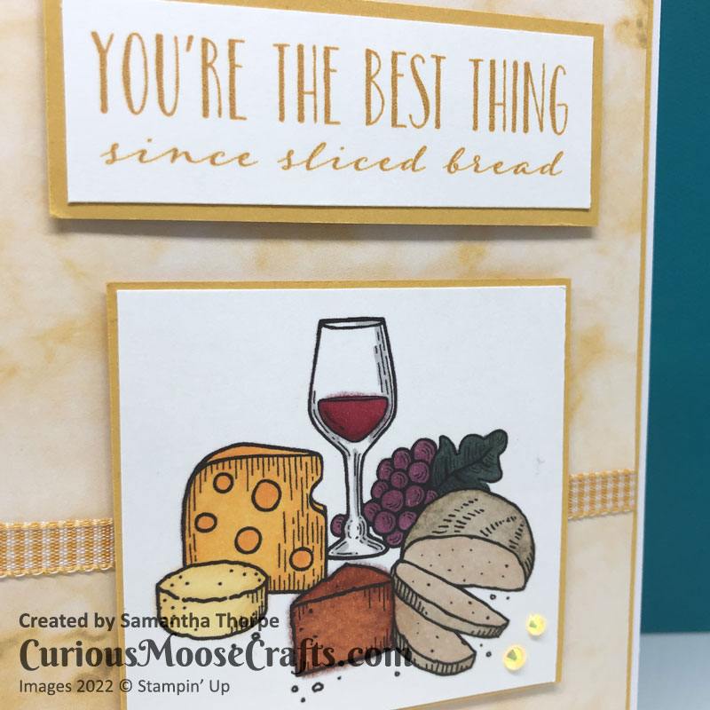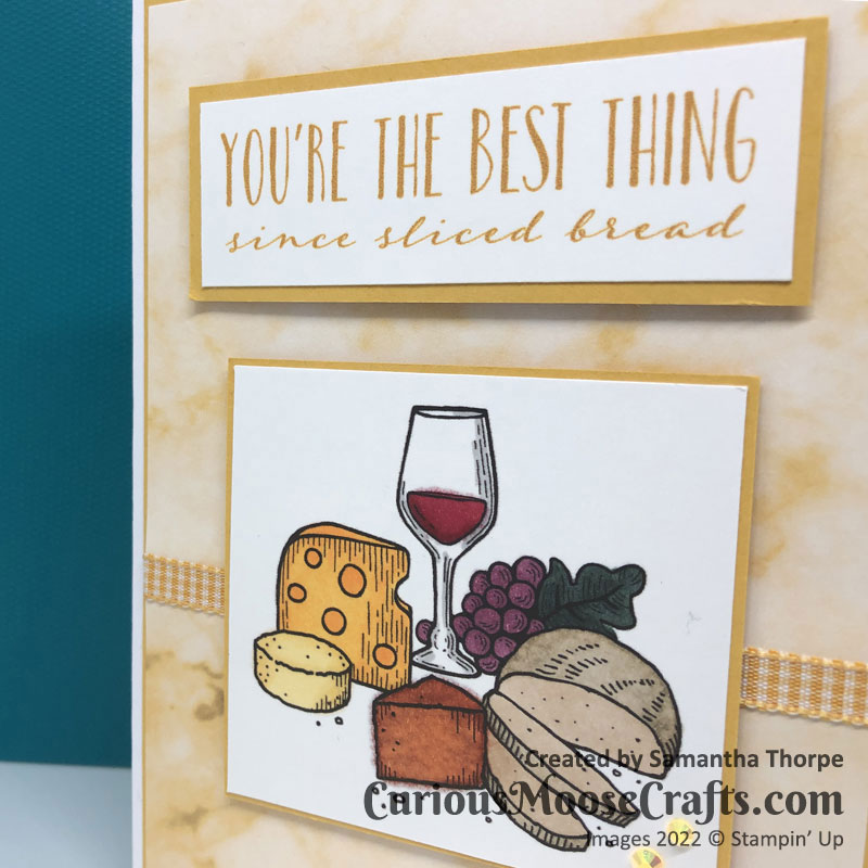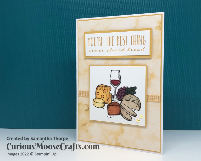 A card made with double freebies today. The Sale-a-bration freebie Simply Marbelous patterned papers and the United Through Creativity download. You can find the free download on the Stampin’ Up! website under Sales and Specials. I printed out the sentiment and image on my home printer and coloured in with Stampin’ Blends.