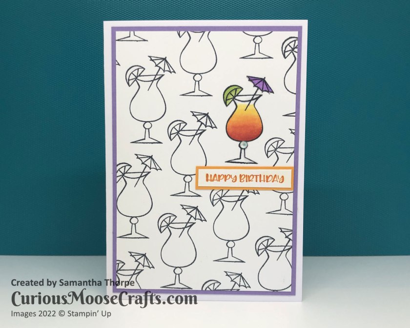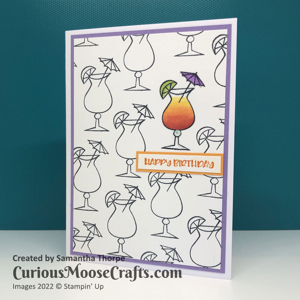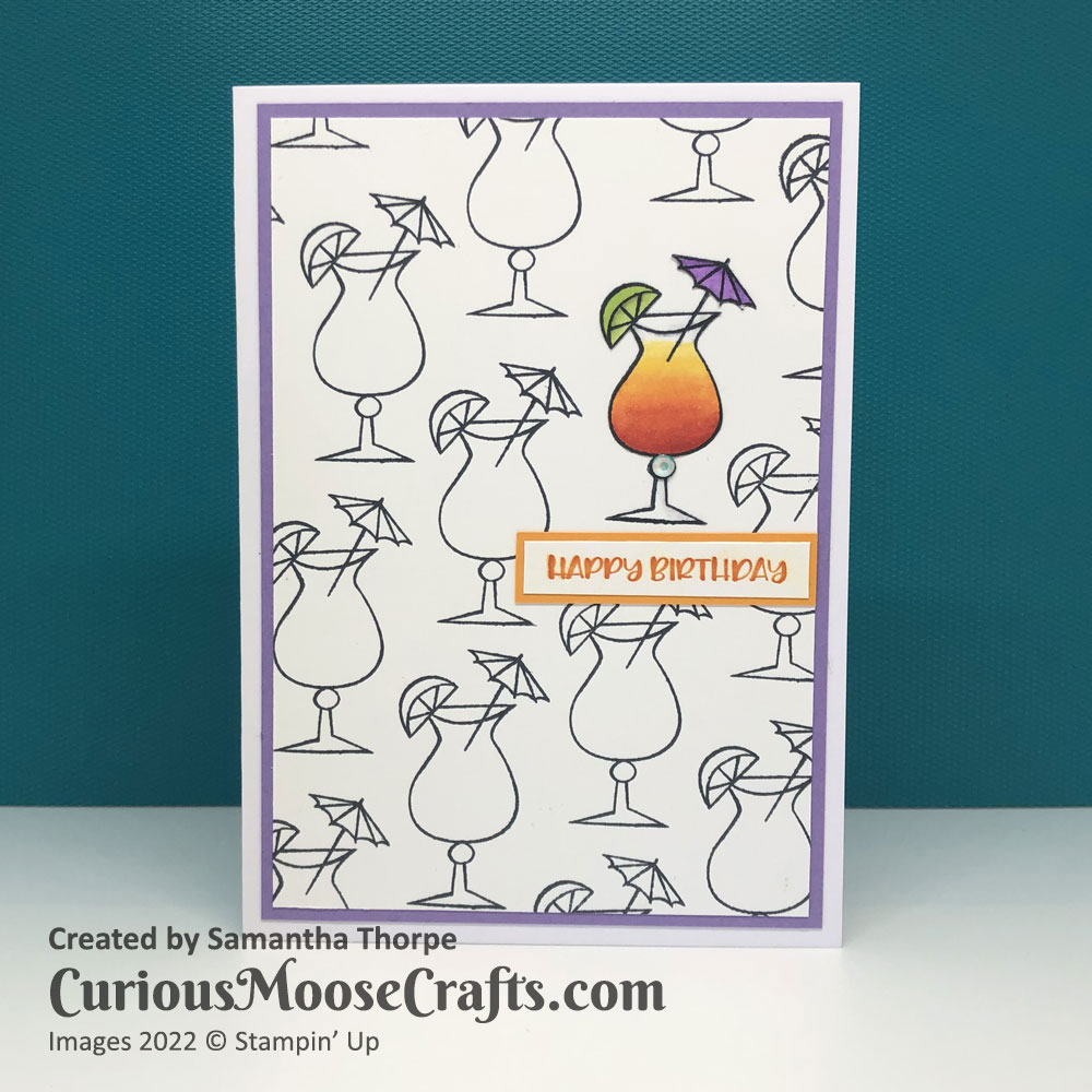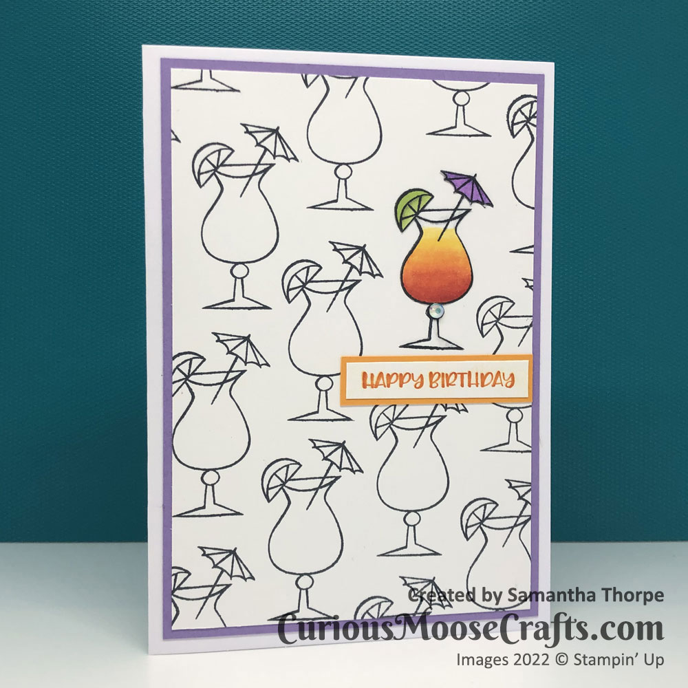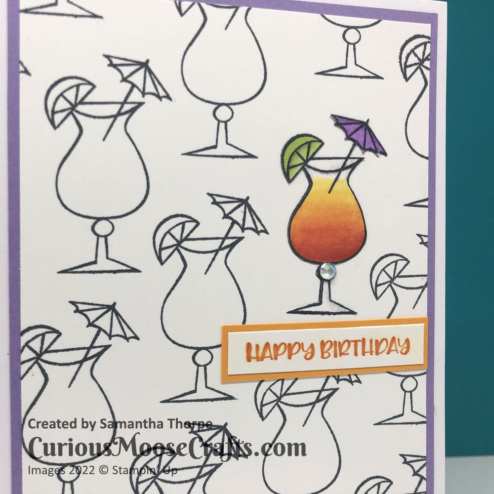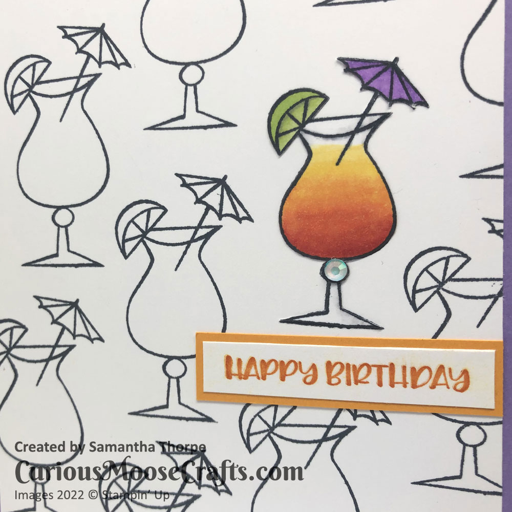 I stamped many cocktails on a single sheet of white card, and then one more on a scrap piece. I used Stampin’ Blends to colour in the scrap and cut it out with snips scissors. I lay this on top of one of the cocktails on the main sheet, added a sentiment and the teeniest amount of bling and that’s it!