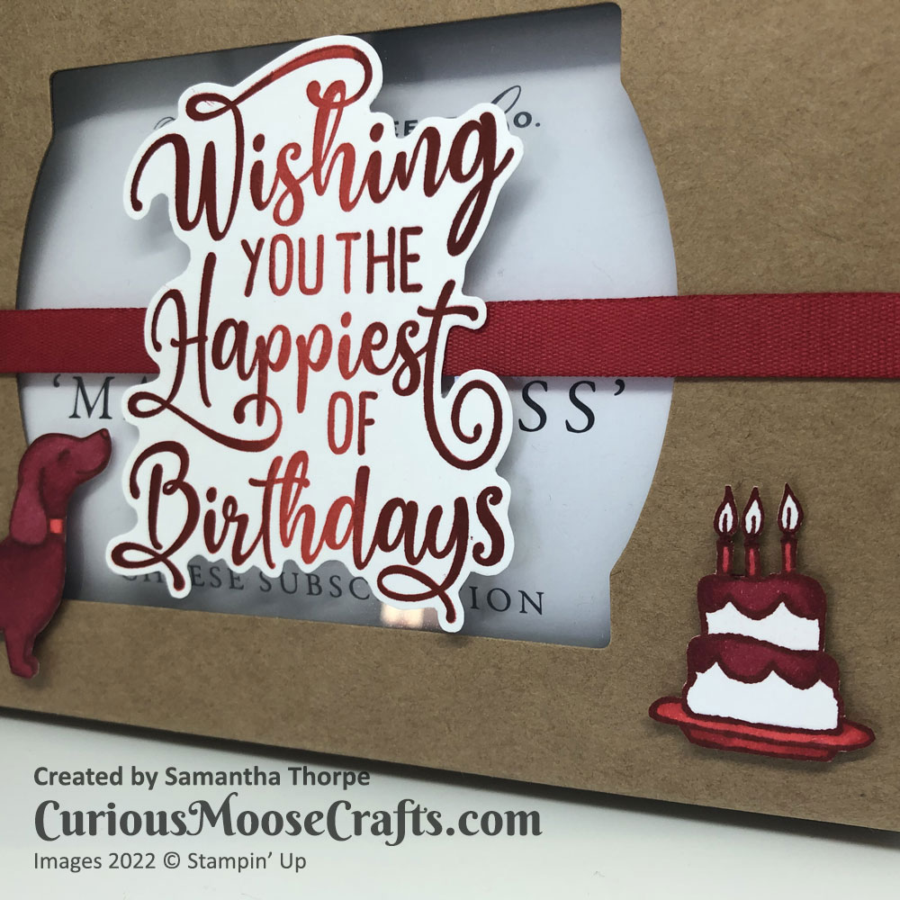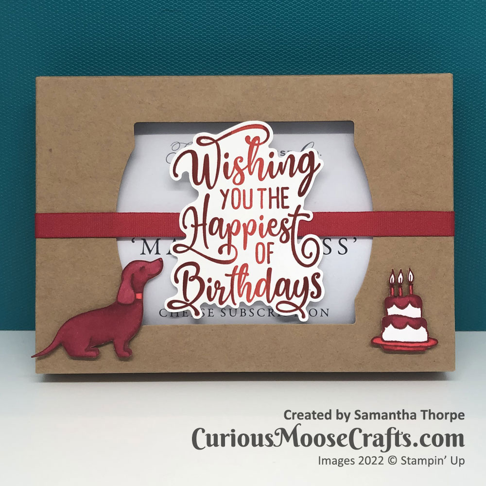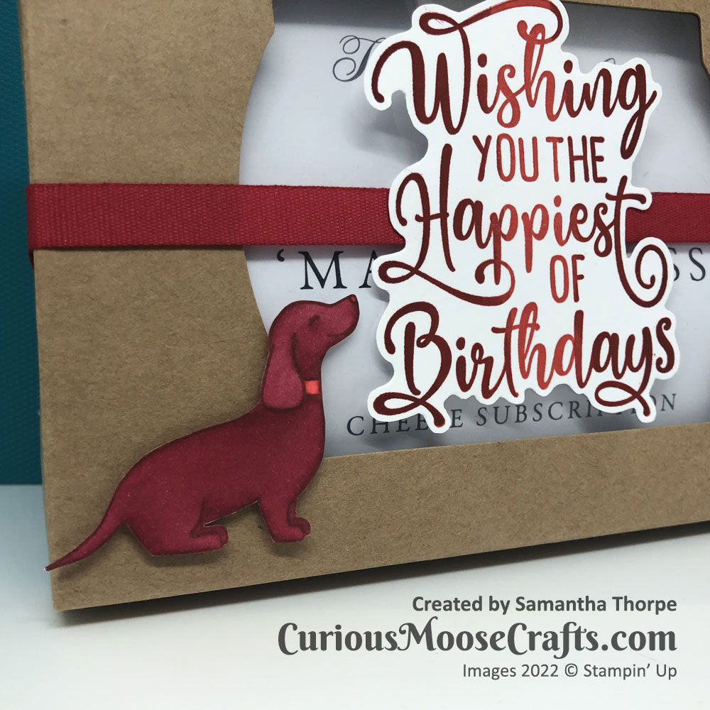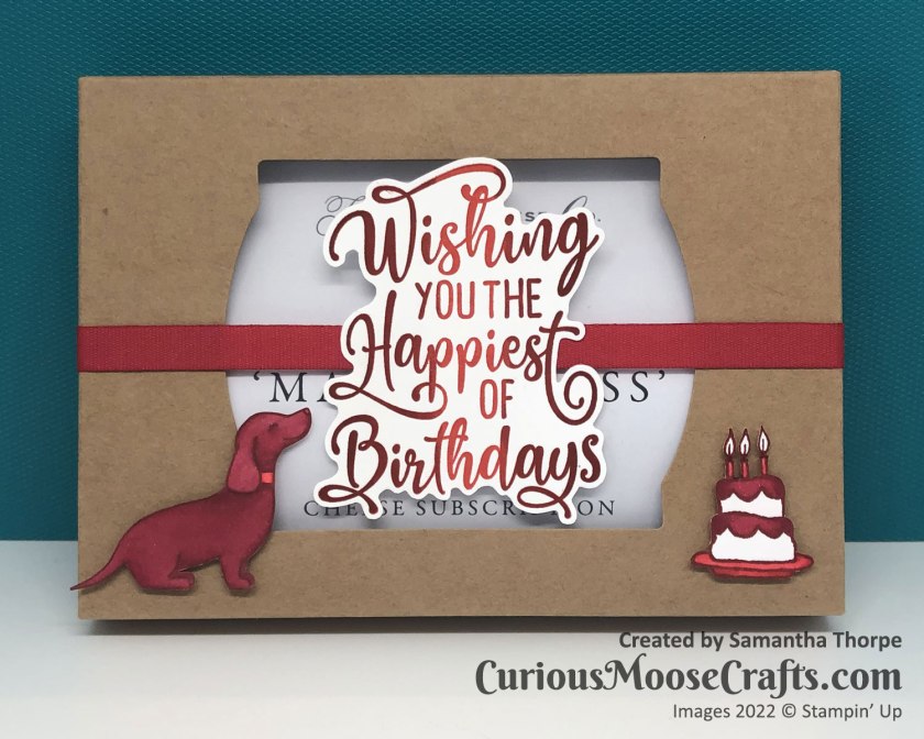 To spice up a paper gift I wrapped it in a kraft gift box and decorated with ribbon and stamped images. To get the ombre effect on the sentiment I used the Stamparatus and strips of masking paper. This allowed me to stamp different sections with different shades of red. My first play with masking paper and lots more things to try! Plus how cute is the sausage dog. 🙂